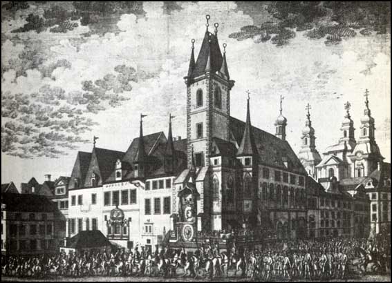 1621. Pozoruhodné je, že orloj je zobrazen se třemi ciferníky nad sebou. Malíř patrně značně zaimprovizoval.