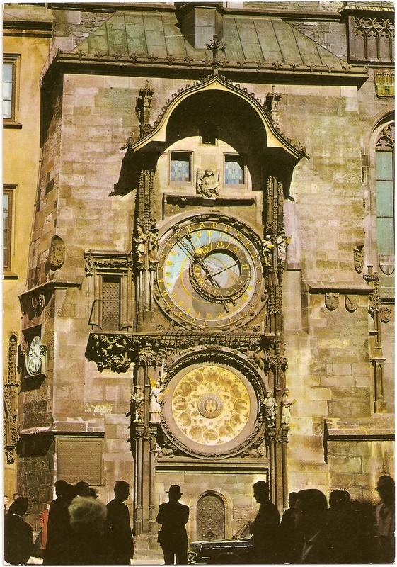 Pohled - orloj v 60. letech. Na astronomickém ciferníku byla v té době chybně namalovaná noc.