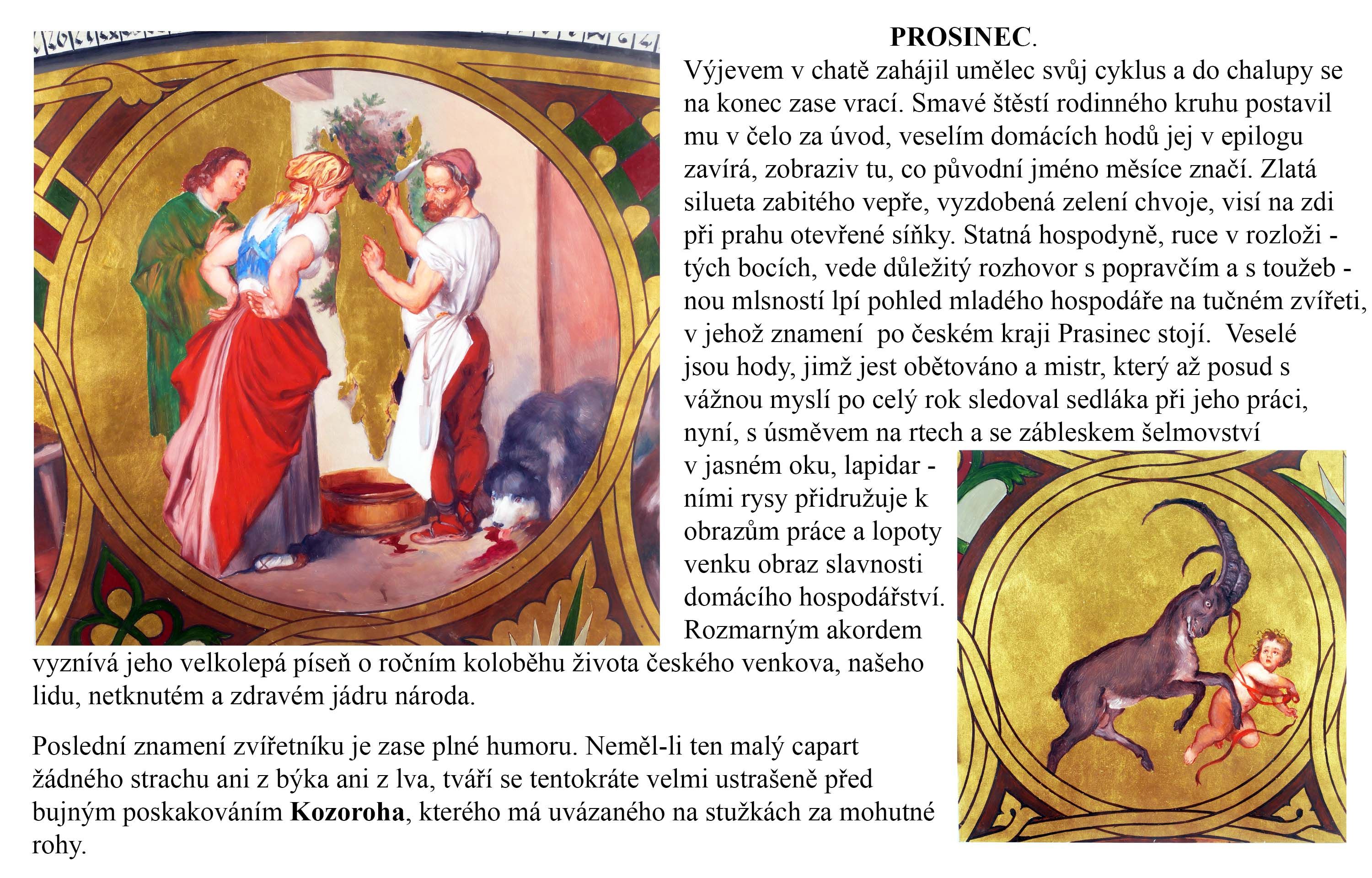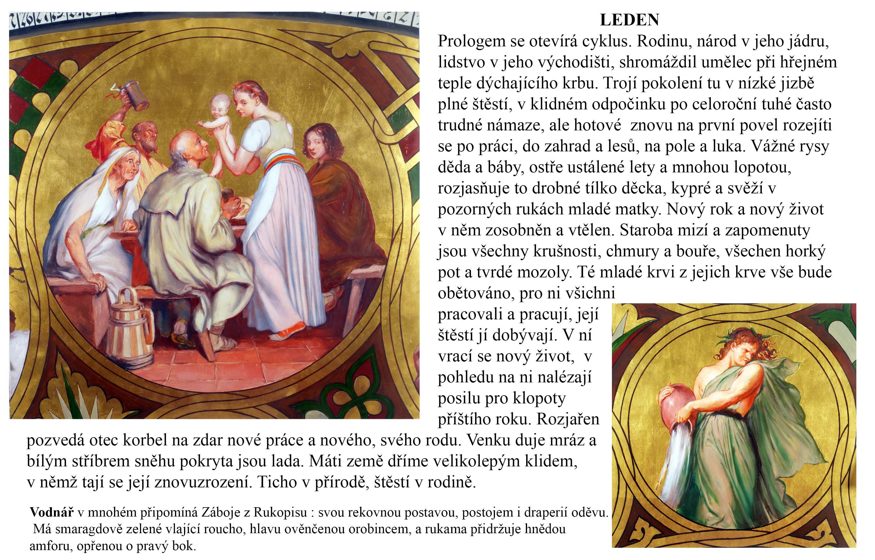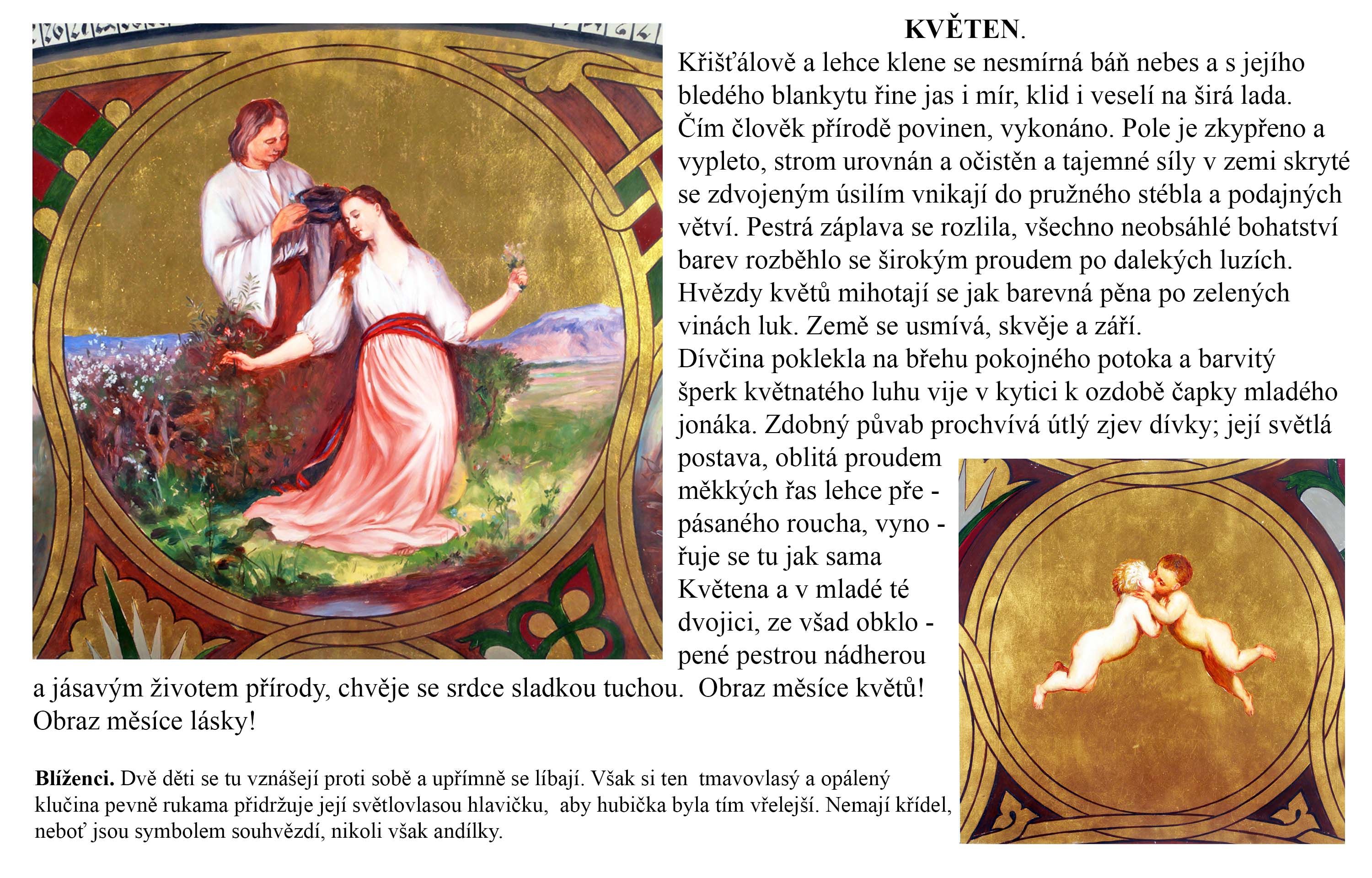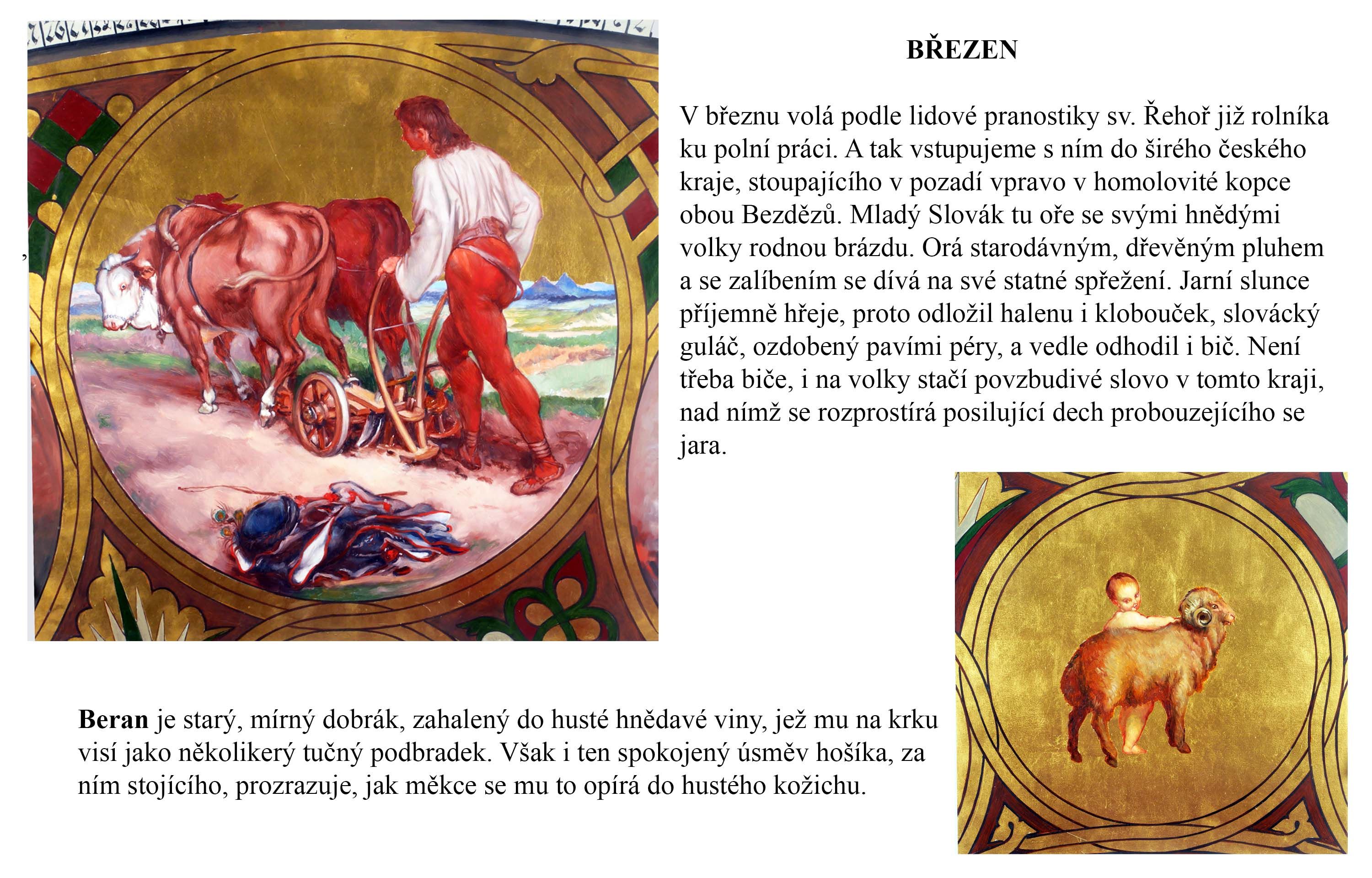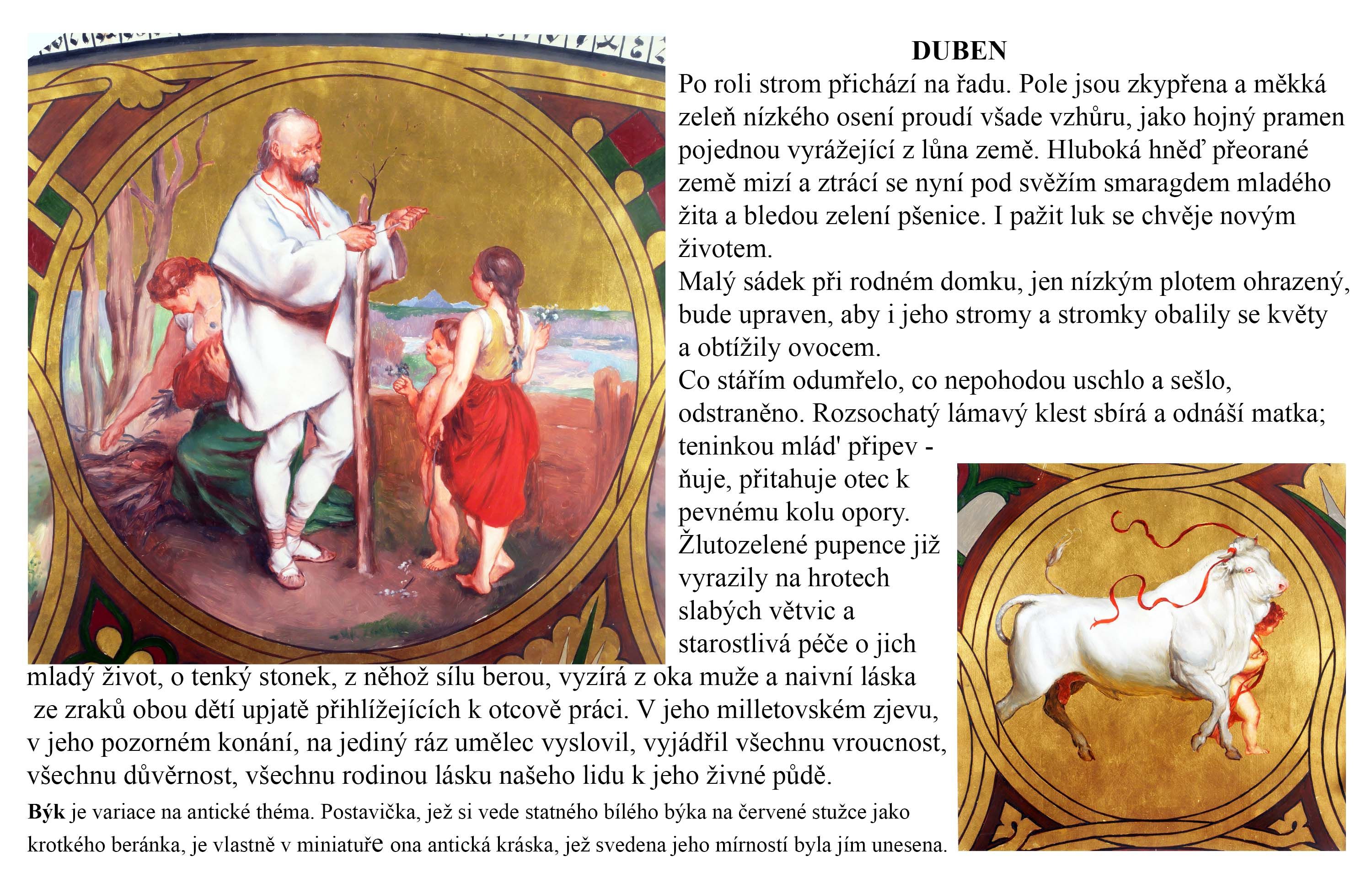 Roj dětí, nahých, boubelatých, zdravím a roztomilostí překypujících drobných postaviček, přidružil Mánes jako věnec zářivých květů k svým obrazům měsíců. Rozehřívající, smavé slunce jara jakoby oblévalo jejich tílka, s jich dětským čtveráctvím a šelmovstvím v souhlase. Proud svojí měkkou krásou jímajících linií prostupuje těmito malými medailonky a znamení Zvířetníku; roztomilí jich průvodci a pokušitelé, půvabné panny, ano i drsný Lovec a Vodnář jsou vespolným projevem veliké ušlechtilosti Mánesova umění.