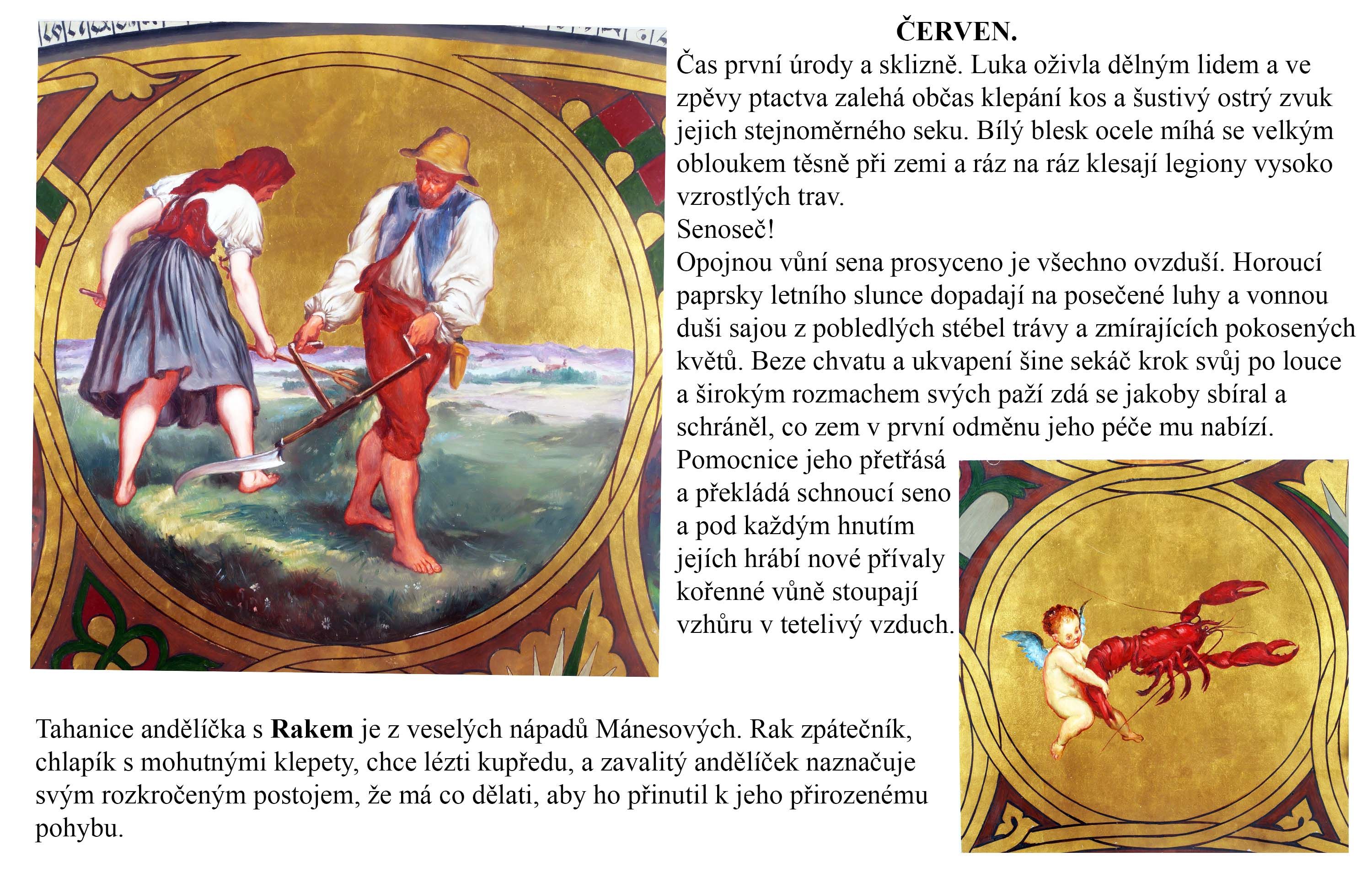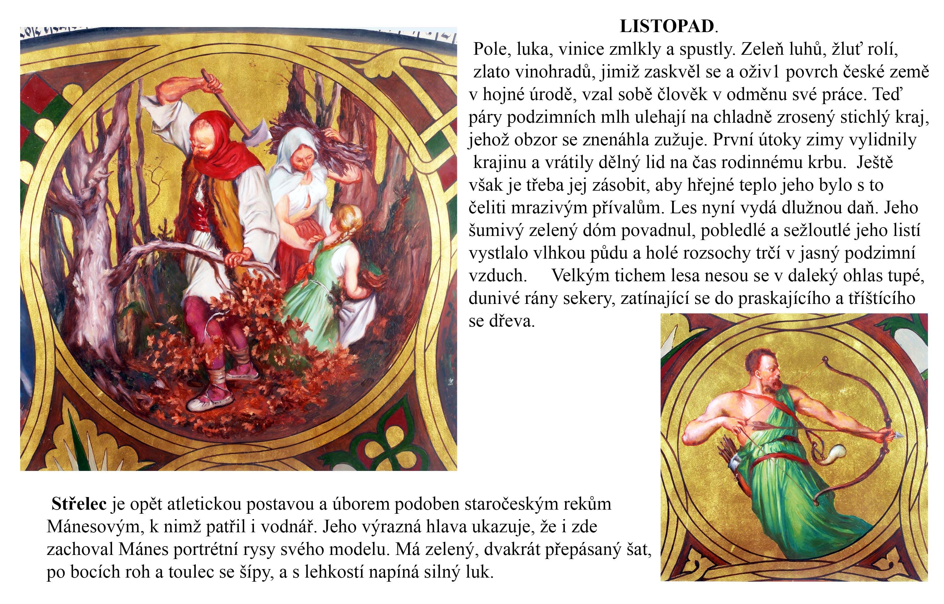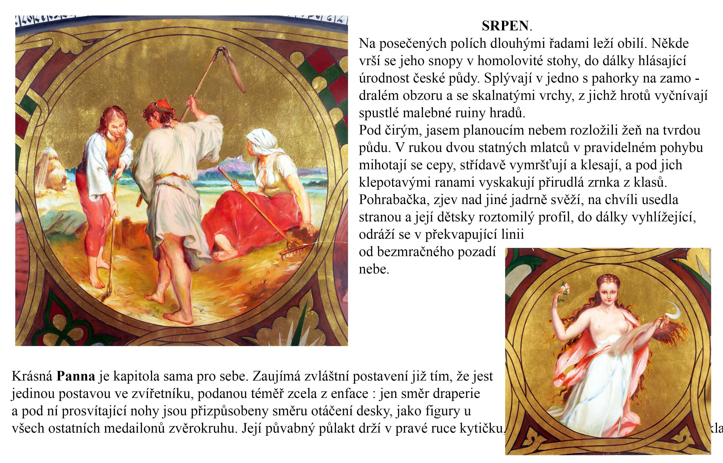 Vyvýšené umístění a nevelký jich rozměr zajisté že byly příčinou, proč umělec všady počet svých postav na nejmenší číslo uvedl, proč horizont kraje všady co nejvíce snížil. Obrysy jeho postav rýsují se zato málem v celé své výšce a rozloze na zlatém pozadí, zastupujícím modravou báni nebes. Tu klečí a sedí, nahýbají se a vzpřimují; jednou v širokém rozmachu, po druhé v klidu a odpočinku, ale nechť je fysická a psychická jich funkce jakákoli, podivujte se onomu uměleckému důvtipu, oné jemnoduché rozvaze, s jakou J. Mánes rozestavuje své ženy a muže, své děti a starce, s jakou rozkládá jich hmotu a pohyb po kruhovité ploše medailonu, kterou vyplňuje stejnoměrnou vahou, aniž by kde ubral přirozenosti a pravdy, aniž by kde na jejich úkor projevil zúmyslnost!