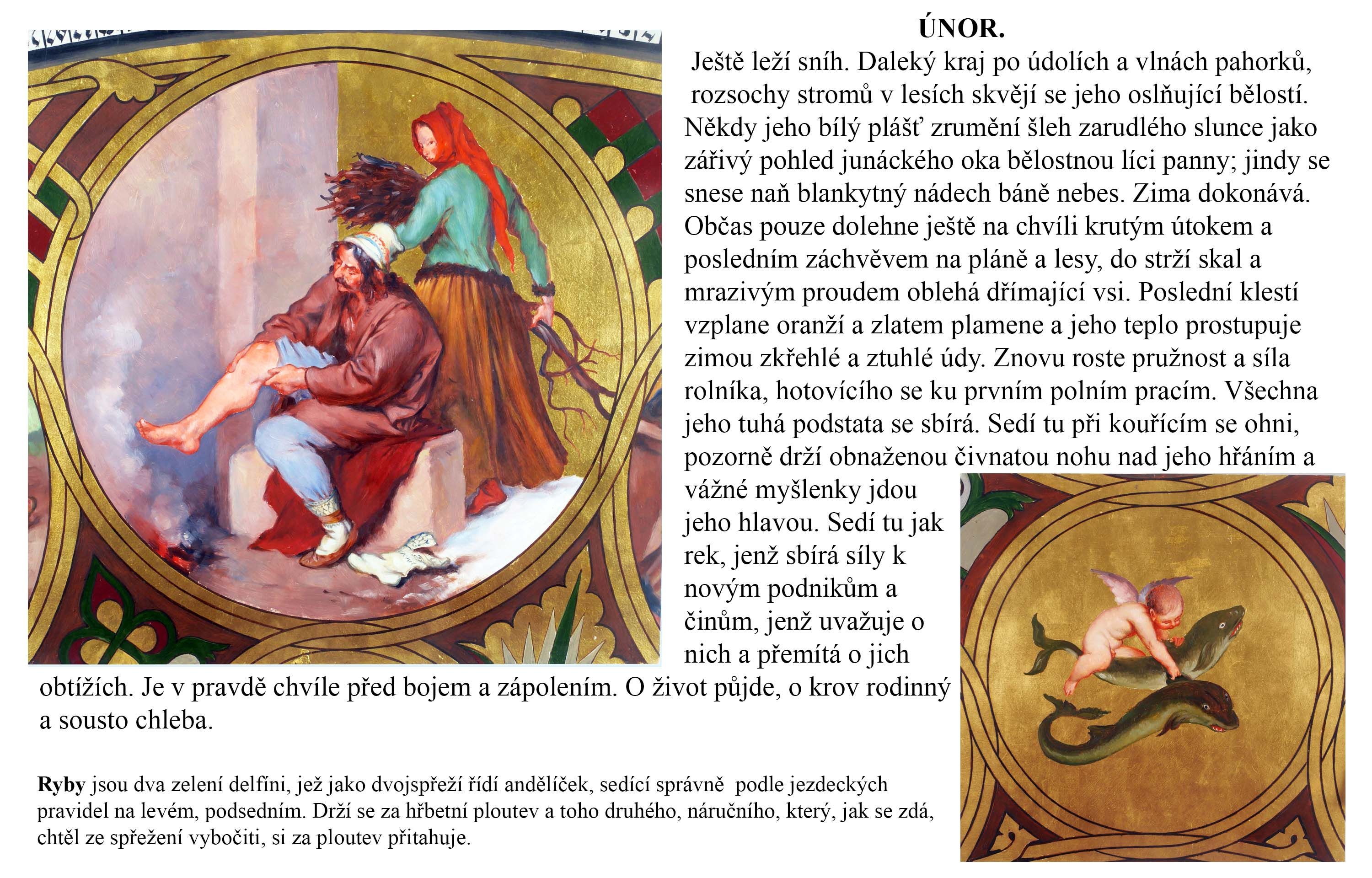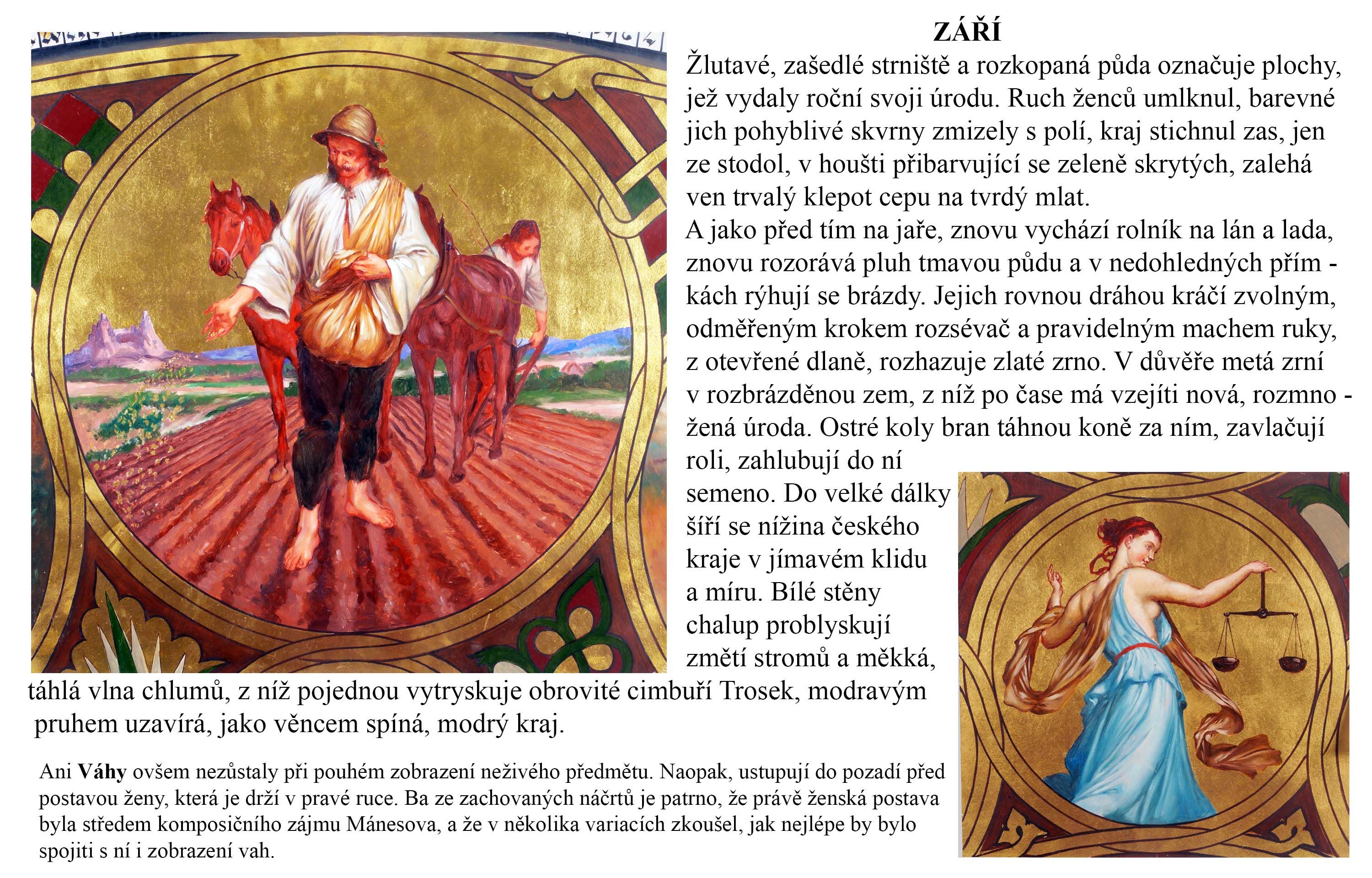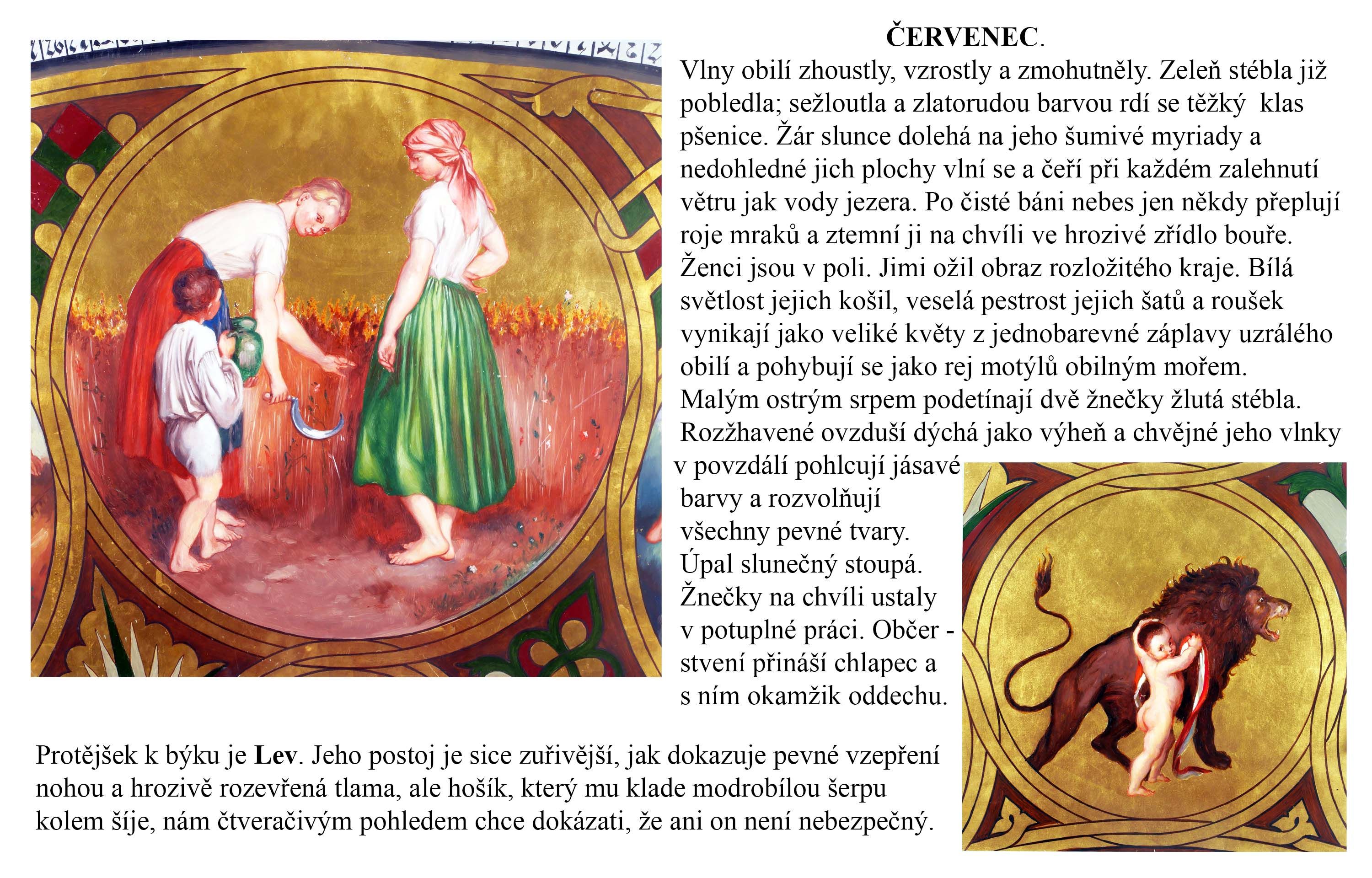 Vyvýšené umístění a nevelký jich rozměr zajisté že byly příčinou, proč umělec všady počet svých postav na nejmenší číslo uvedl, proč horizont kraje všady co nejvíce snížil. Obrysy jeho postav rýsují se zato málem v celé své výšce a rozloze na zlatém pozadí, zastupujícím modravou báni nebes. Tu klečí a sedí, nahýbají se a vzpřimují; jednou v širokém rozmachu, po druhé v klidu a odpočinku, ale nechť je fysická a psychická jich funkce jakákoli, podivujte se onomu uměleckému důvtipu, oné jemnoduché rozvaze, s jakou J. Mánes rozestavuje své ženy a muže, své děti a starce, s jakou rozkládá jich hmotu a pohyb po kruhovité ploše medailonu, kterou vyplňuje stejnoměrnou vahou, aniž by kde ubral přirozenosti a pravdy, aniž by kde na jejich úkor projevil zúmyslnost!