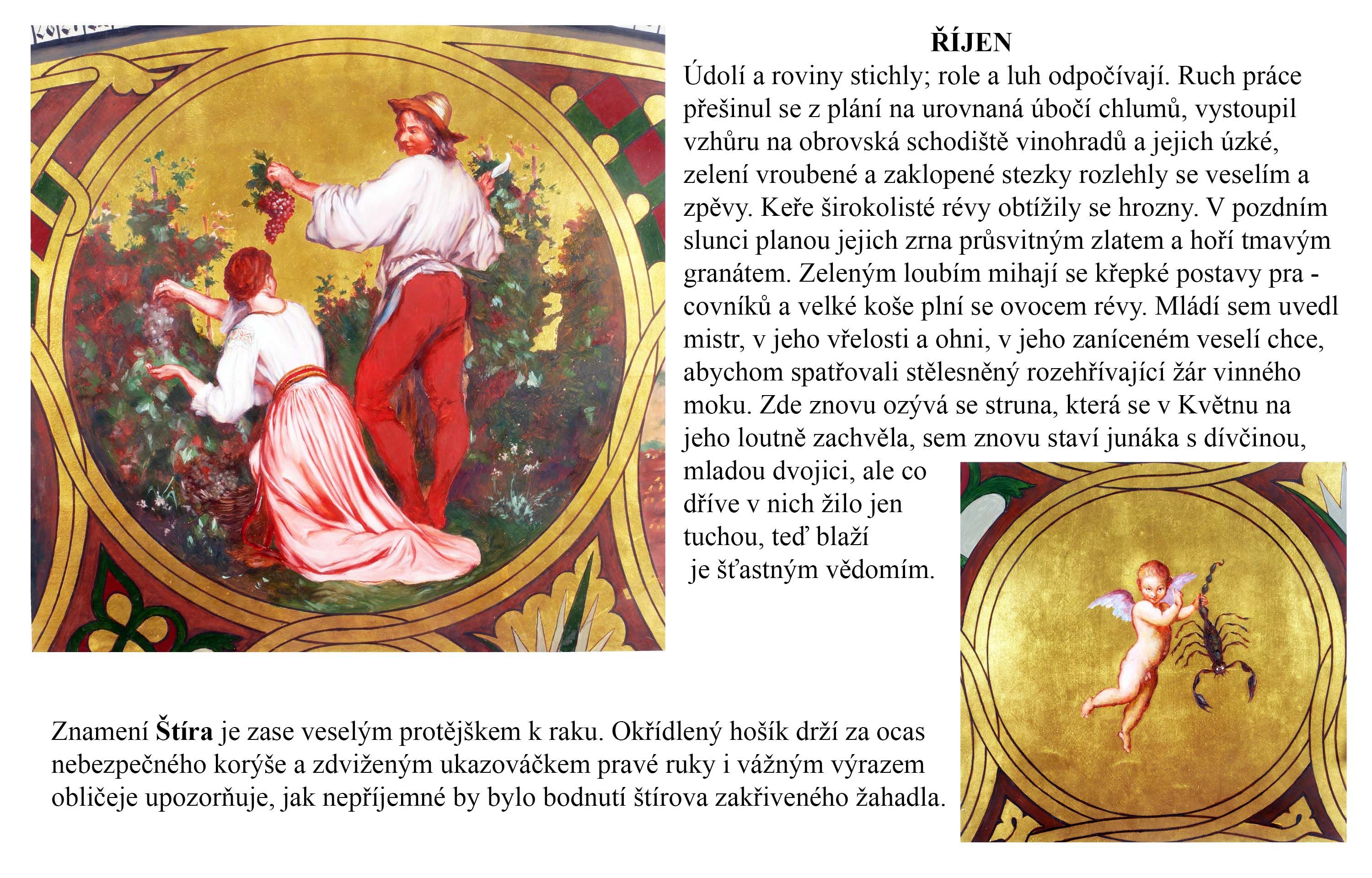 Údolí a roviny stichly; role a luh odpočívají. Ruch práce přešinul se z plání na urovnaná úbočí chlumů, vystoupil vzhůru na obrovská schodiště vinohradů a jejich úzké, zelení vroubené a zaklopené stezky rozlehly se veselím a zpěvy. Keře širokolisté révy obtížily se hrozny. V pozdním slunci planou jejich zrna průsvitným zlatem a hoří tmavým granátem. Zeleným loubím mihají se křepké postavy pracovníků a velké koše plní se ovocem révy.