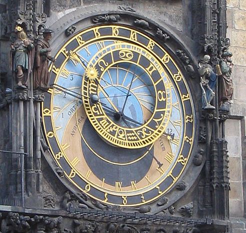 posunutém proti ciferníku běžných hodin. Na Pražském orloji se odečítá na ciferníku 12 + 12 hodin a trochu to plete. Hvězdný čas se počítá od horní kulminace jarního bodu, tedy od okamžiku kdy hvězdička ukazuje vzhůru. To je právě opačně než u rafie Slunce. Pokud rafie Slunce ukazuje vzhůru je poledne, dvanáct hvězdných hodin je dole. |