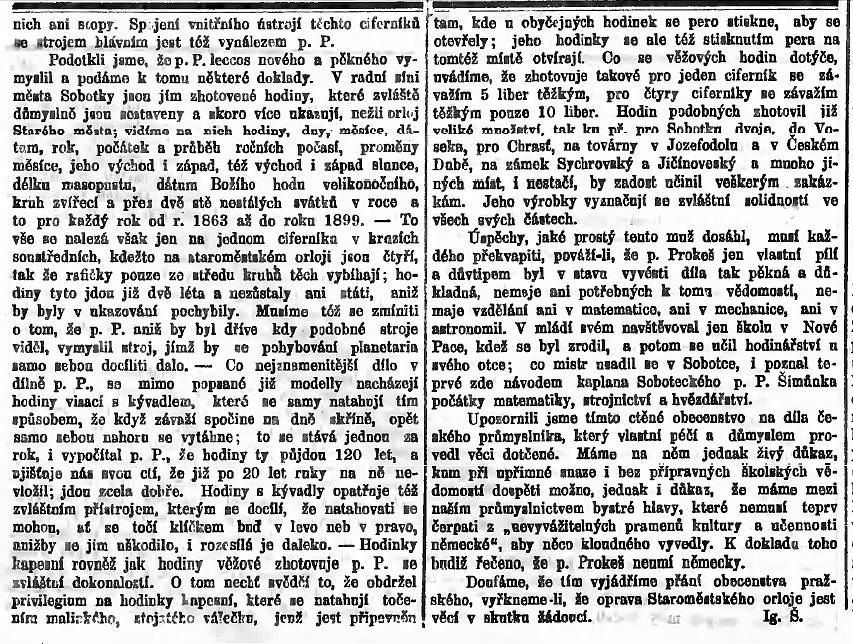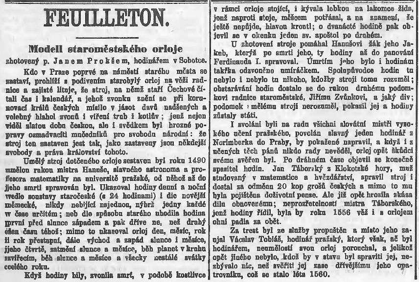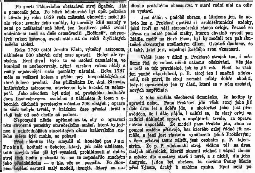Fejeton podepsaný šifrou Ig.Š. uvádí stručnou historii orloje a směřuje k informaci o modelu pana Prokeše, hodináře ze Sobotky. V obecné části jsou různé převzaté údaje se všemi známými rozpory. Uvádí se, že orloj byl sestaven roku 1490 mistrem Hanušem, slavným astronomem a profesorem matematiky. Ukazoval prý také přestupný rok, zatmění Slunce a Měsíce i všechny pohyblivé svátky. Dnes za dobu vzniku považujeme rok 1410 a za autora mistra Mikuláše z Kadaně a nevíme o tom, že by orloj ukazoval vyjmenované údaje.