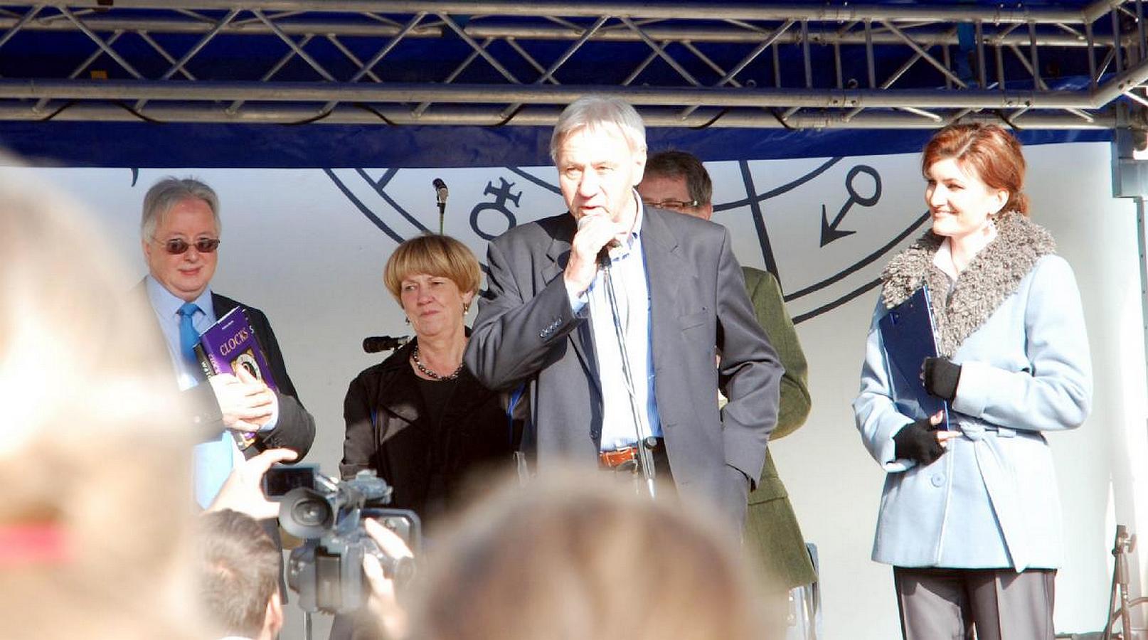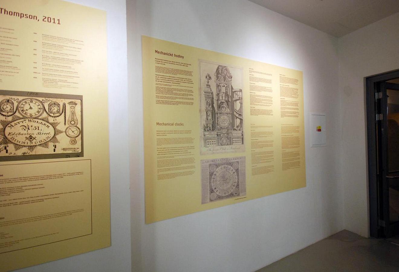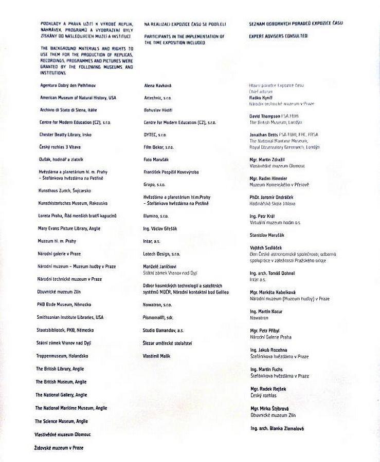 Na expozici se podílelo téměř sedmdesát institucí, organizací nebo jednotlivců z USA, Anglie, Německa, Itálie, Rakouska, Švýcarska nebo Irska a samozřejmě z tuzemska. Na tabuli je napsáno i Virtuální muzeum hodin, ale naše účast byla jen v závěrečné fázi a týkala se, jak je pochopitelné, oddílu o pražském orloji. Atmosféru expozice přibližují fotografie z prvního dne. Muzeu přejeme mnoho spokojených návštěvníků, samostatných i rodinných, a to nejen teď, když je expozice nová, ale i na věčné ... časy.
