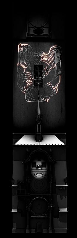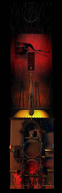 dělo. Byla využita štíhlá a vysoká plocha celé věže i s hodinama a to