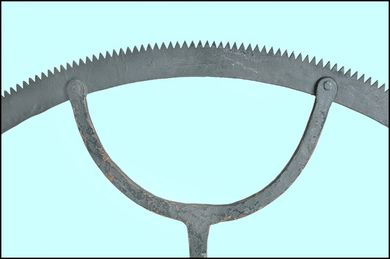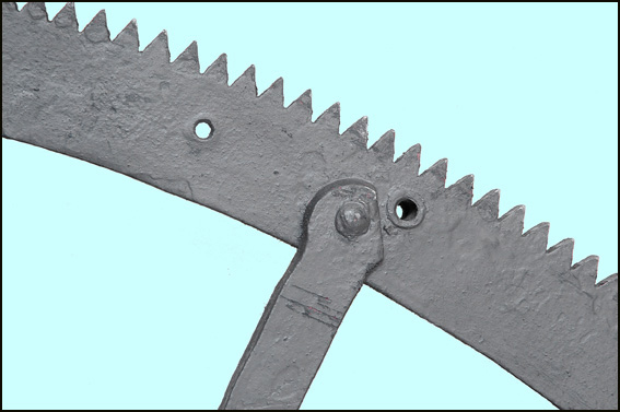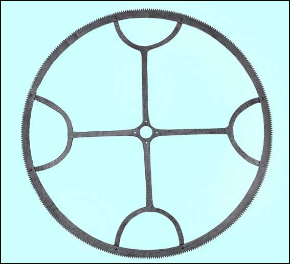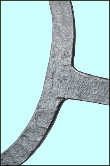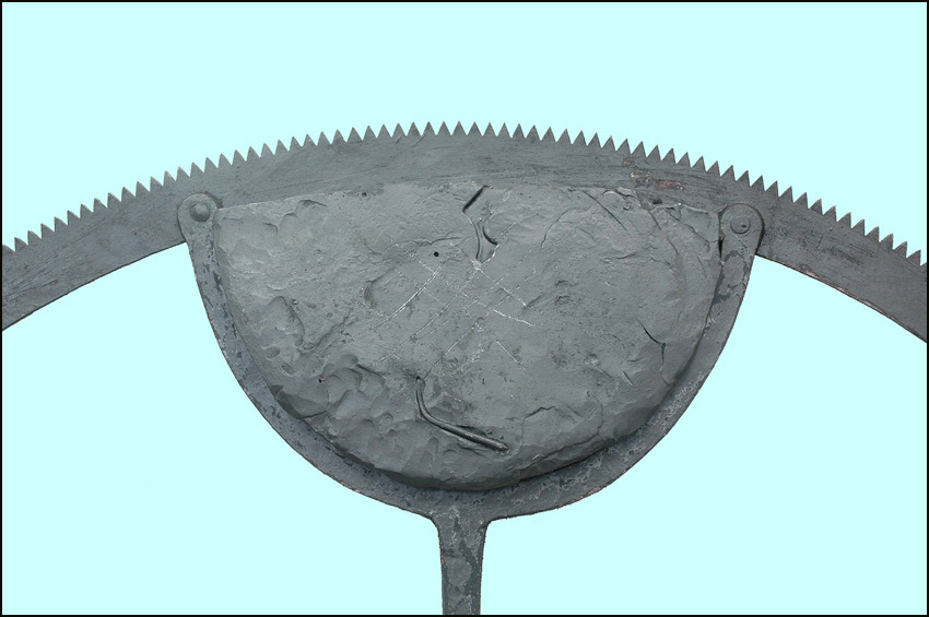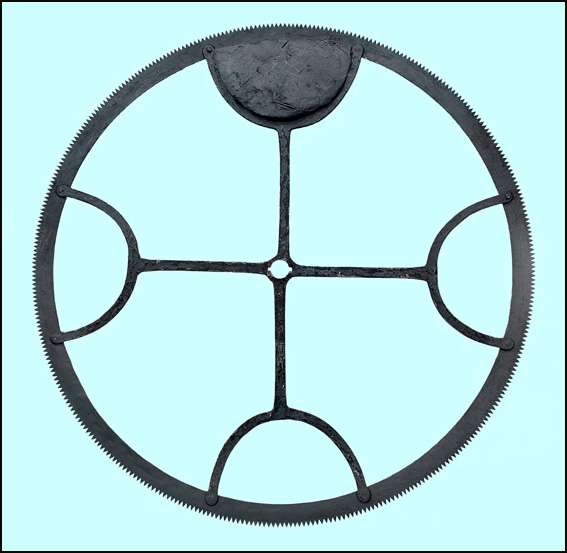 The original forged wheels of the main machine are unique. There are three of them: one for the movement of the zodiac (365 teeth), one for the Sun (366 teeth) and one for the Moon (379 teeth). The hoops are 116 cm in diameter and 10 mm thick. Their surface bears clearly visible ancient marks of their making. For joints, both welding and rivets was used. Partially deflected and deformed reinforcements are marks of centring. The teeth are of triangular shape; they were preforged and then sawed into the precise shape. On the inward edge of the wheel for the movement of Zodiac, there is a counterweight because the ring of Zodiac on the perimeter of the astronomical dial is positioned eccentrically and the entire system must be wellbalanced during rotation.