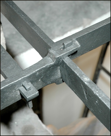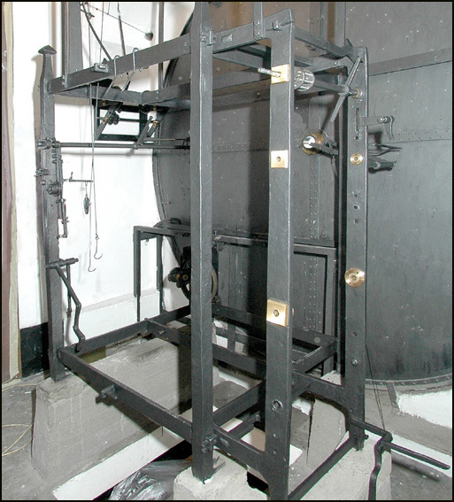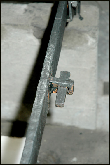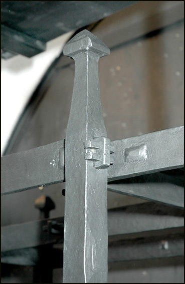 The greater part of his work on the clock has been preserved until today, for six hundred years. The mighty column structure of the fundamental frame is capped by four forged spikes. The horizontal and vertical bars are attached to the frame by wedging through forged holes. Other parts of the machine and elements with new functions were attached to the frame later. Initially, the frame was constructed on an internal wooden structure. This structure burned down in 1945; today the frame is embedded in concrete and that is why it remained on its place during renovations.